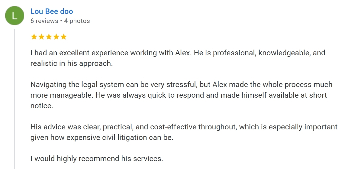 "We went to Alex initially when faced with legal threats and he helped immediately to instil a sense of control into the situation. He is a practical and patient man with a calm, controlled and reassuring manner. This clearly comes from his extensive legal and commercial knowledge. He is very methodical and studied the detail with endless patience. His hard work ethic and thorough knowledge of our case ensured that the outcome of the Mediation was in our favour. We wouldn’t hesitate to recommend him."